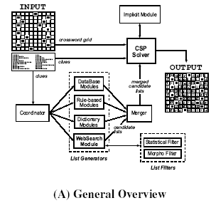 | We designed WebCrow's architecture (figure below) using some insights from Proverb's. The information flow is similar: in a first phase the clues are analyzed by a set of candidate-list generators (the expert modules). Among these the preliminary role is played by the Web Search Module (WSM). Each list contains a global confidence score and a set of words ordered by probability. These candidate lists are passed to a merger system that produces a unique list for each clue. In a second phase, a constraint-satisfaction algorithm carries forward the grid-filling, in order to place the correct words within the slots. |