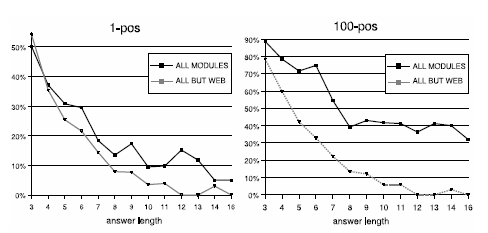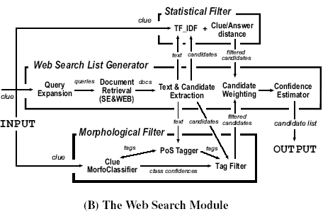 | The Web Search Module represents the heart of WebCrow and the main innovation with respect to the literature. The goal of this important module recalls that of a Web-based Question Answering system. The idea is to exploit the Web and search engines (SE) in order to find sensible answers to questions expressed in natural language. However, with crossword clues, the nature of the problem changes sensibly, often becoming more challenging than classic QA. The only evident advantage in crossword solving is that we priorly know the exact length of the words that we are seeking. We believe that, thanks to this property, web search can be extremely effective. |