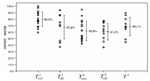 | The figure above shows WebCrow's performance on each example. On T1 ord the results were quite impressive: the average number of targets in rst position was just above 40% and the CSP module raised this to 80.0%, with 90.1% correct letters. In one occasion WebCrow perfectly completed the grid. With T1 dif WebCrow was able to ll correctly 67.6% of the slots and 81.2% of the letters (98.6% in one case) which is more or less the result of a beginner human player. On T2 new WebCrow performs with less accuracy averaging 62:9% (72% letters). On T2 old (old crosswords), due to the constant refreshing of Web's information, the average number of correct words goes down to 61.3% (72.9% letters). In the last subset the solving module is able to reach 69.1% words correct and 82.1% letters correct. Altogether, WebCrow's performance over the test set is of 68.8% (ranging from 36.5% to 100%) correct words and 79.9% (ranging from 48.7% to 100%) correct letters. |