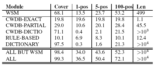 the heart of WebCrow's architecture, is able to produce impressive answering performances. It is in fact the module that provides the best coverage/precision balance, as it can be observed in the next table (first two columns). In over half of cases the correct answer can be found within the first 100 candidates within a list containing more than 10^5 words. The contribution of the WSM can be appreciated in the last two rows of the table where we observe the loss of performance of the whole system when the WSM is removed. The overall coverage of the system is mainly guaranteed by the Dictionary module, but the introduction of the WSM is fundamental to increase sensibly the rank of the correct answer. |